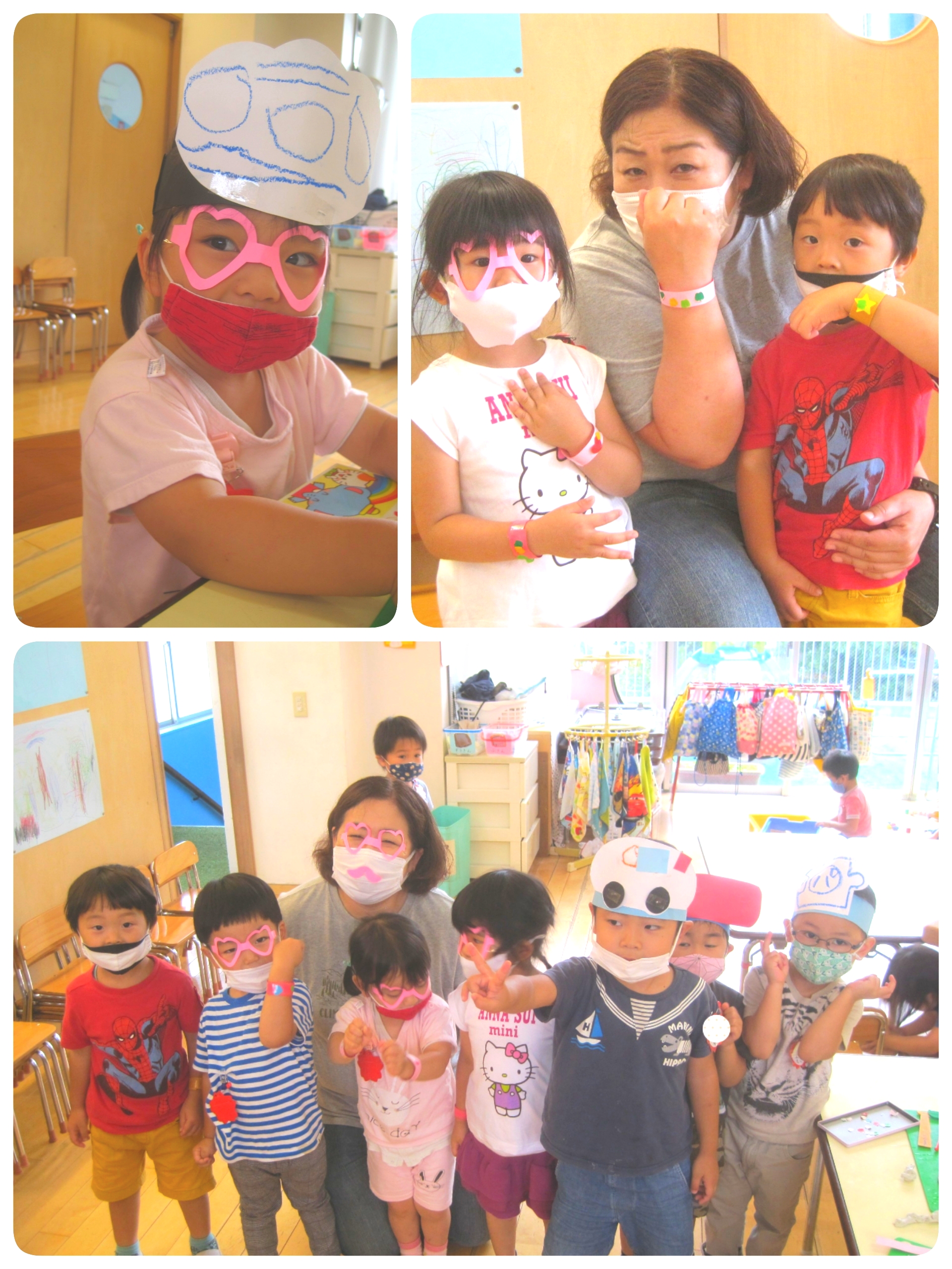 いちごぐみのお部屋の様子は…何やらお面や帽子を被って遊んでいる子があちらにもこちらにも(^^)