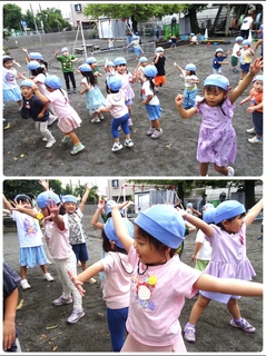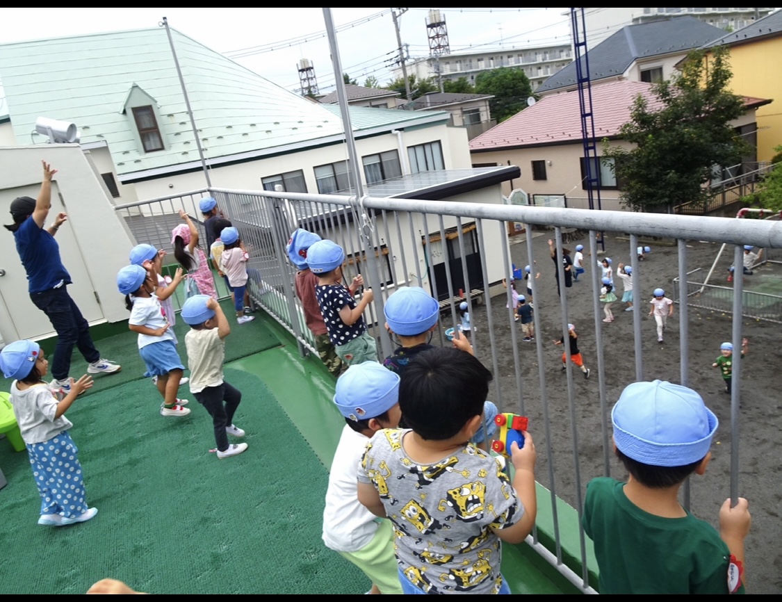 朝テラスで遊んでいると、園庭からいちごさんが大好きになった曲が聞こえてきました。どんぐりさんが教えてくれた「ホ!ホ!ホ!」の歌です🎵踊っていたのはたんぽぽさんでした。「一緒に踊ろうー!」と誘ってくれたたんぽぽさんに「今行くから待っててねー」と伝え園庭へと急ぎした。踊りたくてウキウキしながら階段をおりましたね。どんぐりさんが合流してからもう1回♪みんなでたくさん踊って楽しかったね✨ak