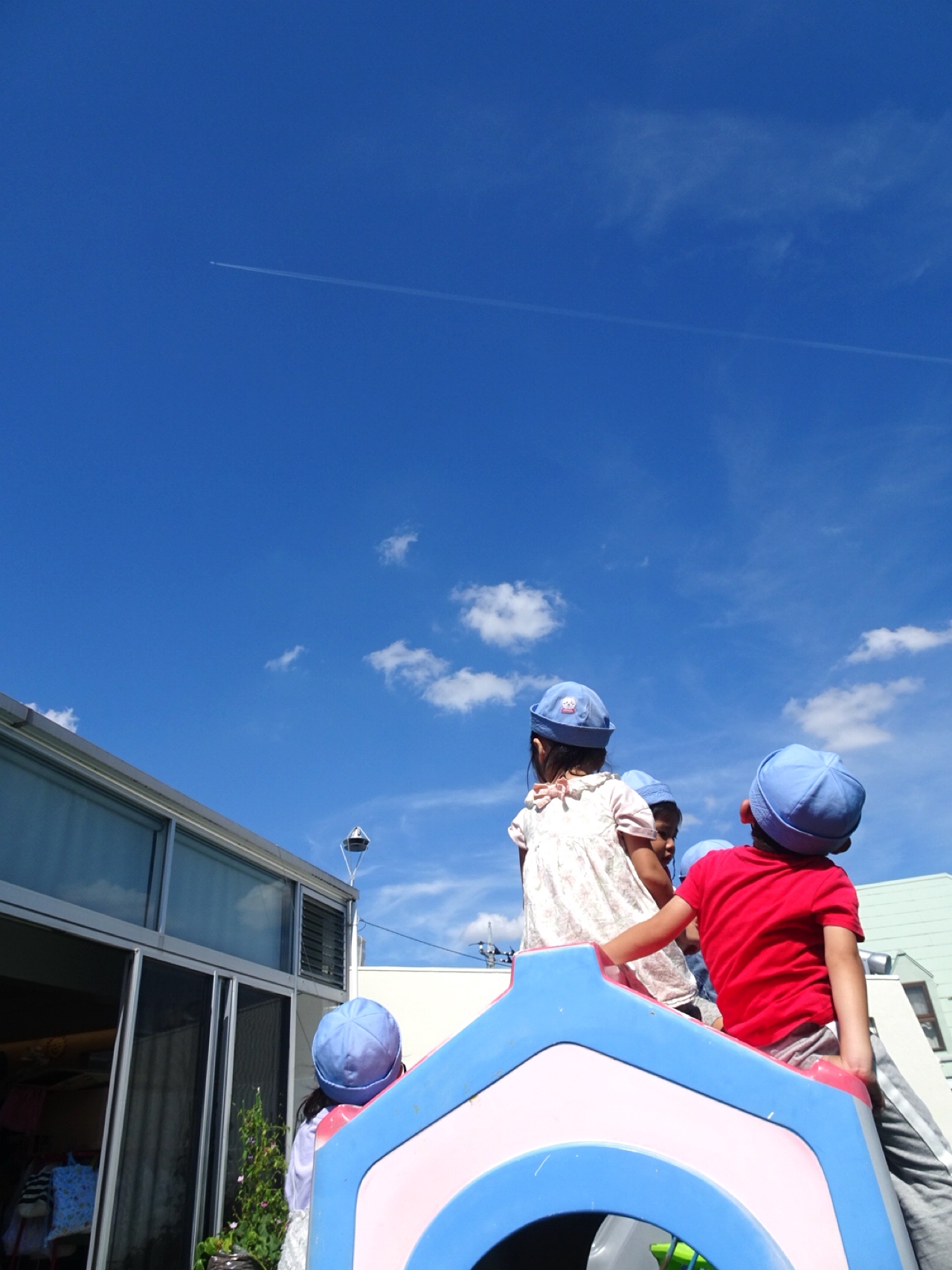 「先生、飛行機雲だ!どこまでのびるかな?」そう言って空を見上げているDくん。その声にテラスにいたみんなが気付いて空を見上げました。なんだか素敵な場面でした。ak