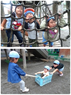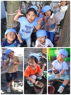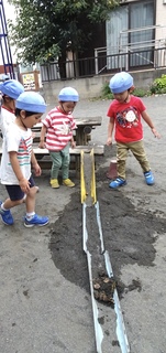 「先生ちょっと来て」そう呼びに来てくれたのはFくん。「ぼくどんぐりコロコロゲーム作ったんだよ」そう言って見せてくれたのはベンチを使い、上手に傾斜をつけた雨樋の形をした遊具です。まん丸どんぐりを置くとコロコロと転がりはじめました。転がるように繋ぎ目を砂で覆い工夫したんだね。完成させた装置を前に満足そうないちごさんです。幼稚園の園庭にはプックリ膨らんだまん丸のくぬぎが沢山落ちています。秋の季節の遊びを大発見ですね。ak
