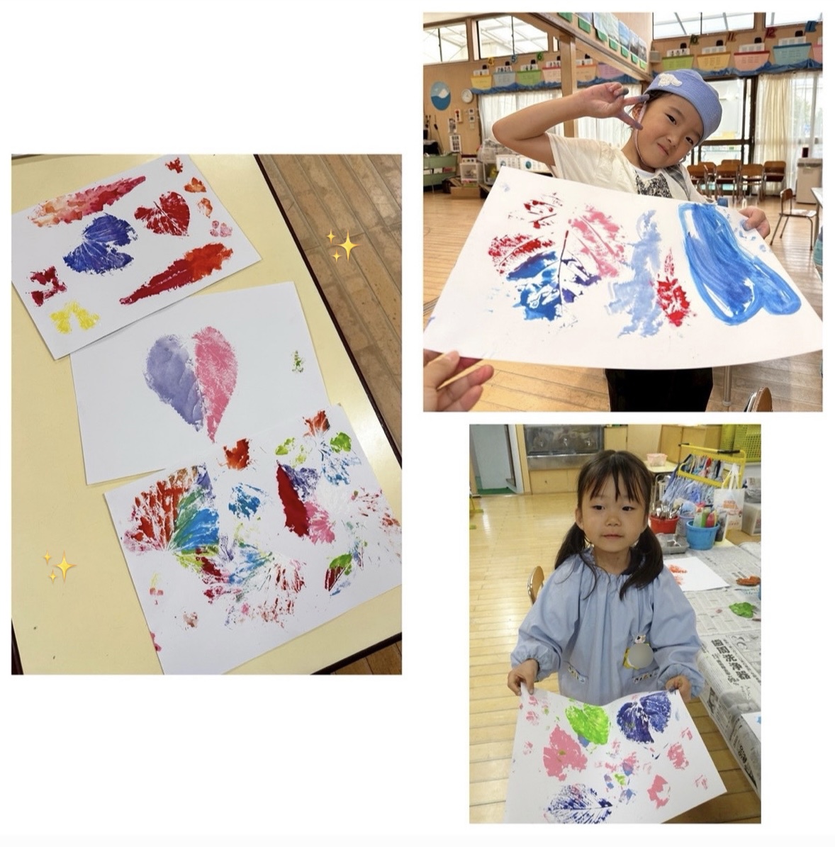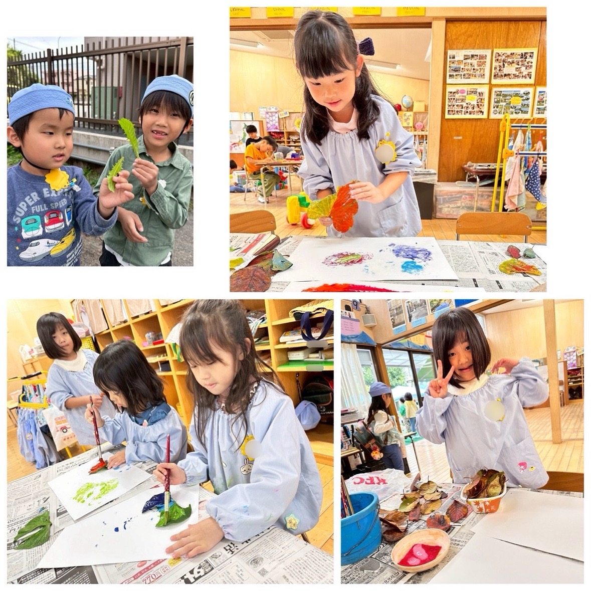 おいもほりのときにもらったハートの葉っぱをきっかけに、いろいろな葉っぱを集めてスタンプ遊びをしました🍁赤や黄色、緑、紫などさまざまな色の絵の具を葉っぱに付けて、1人ひとり違う素敵な色のスタンプができました✨また秋の葉っぱを集めてスタンプ遊びをして、まだまだ続く秋の季節を楽しみたいですね☺️am