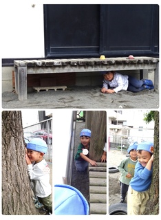 まーだだよもういいよーかくれんぼをはじめたら、あっちからもこっちからも「いれて」と友だちが集まってきました。隠れる場所も色々でワクワクした外遊びでした。ak