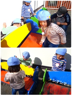 シマシマさんが集まって、T先生とベンチをシマシマに変身させていました。