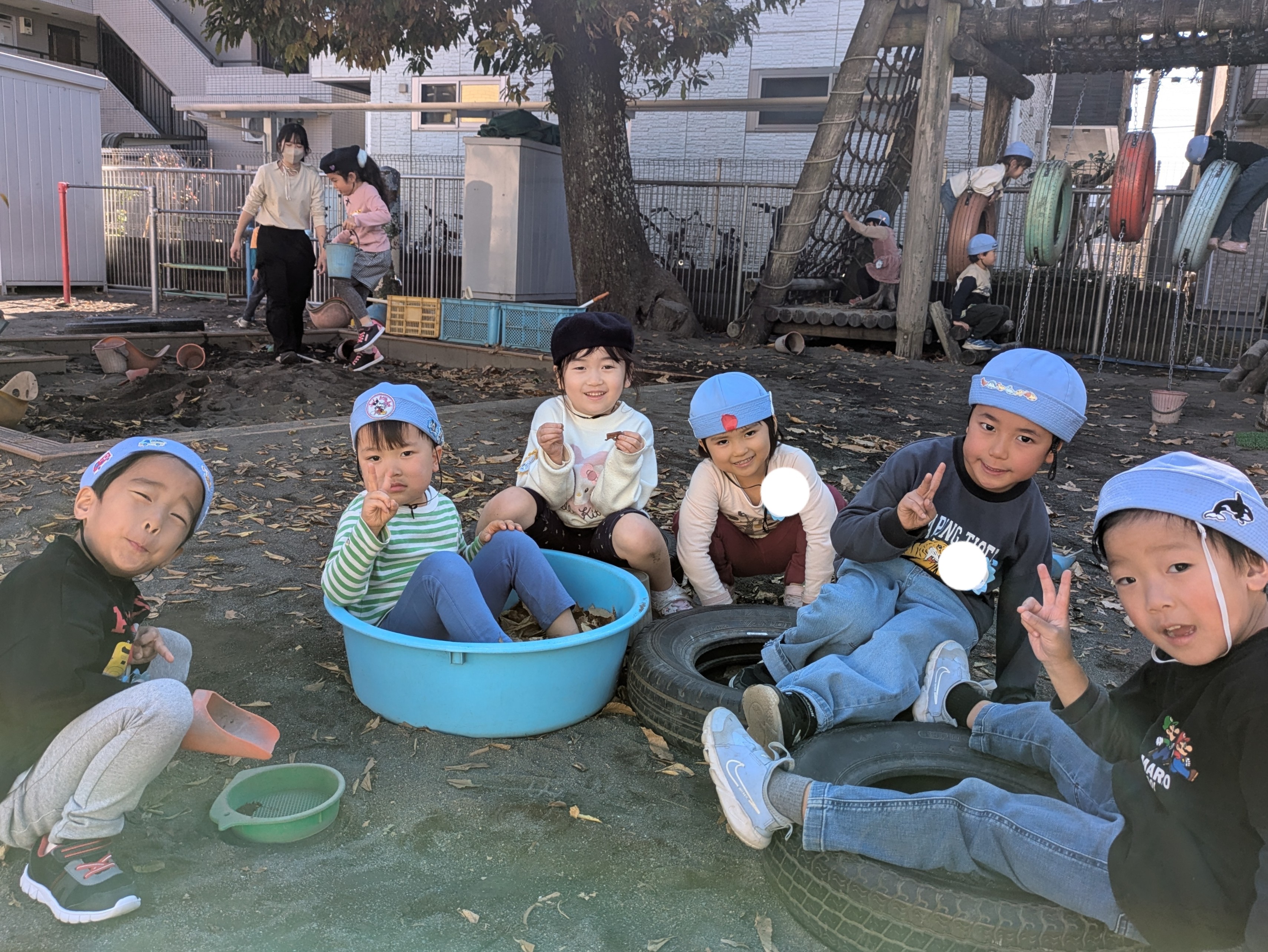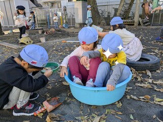園庭に落ちている葉っぱを集めて温泉を作り温まっていましたよ♨️砂と混ざらないようにふるいにかけてお湯作り☺️たんぽぽさんも温泉に来てくれて嬉しかったね!mh