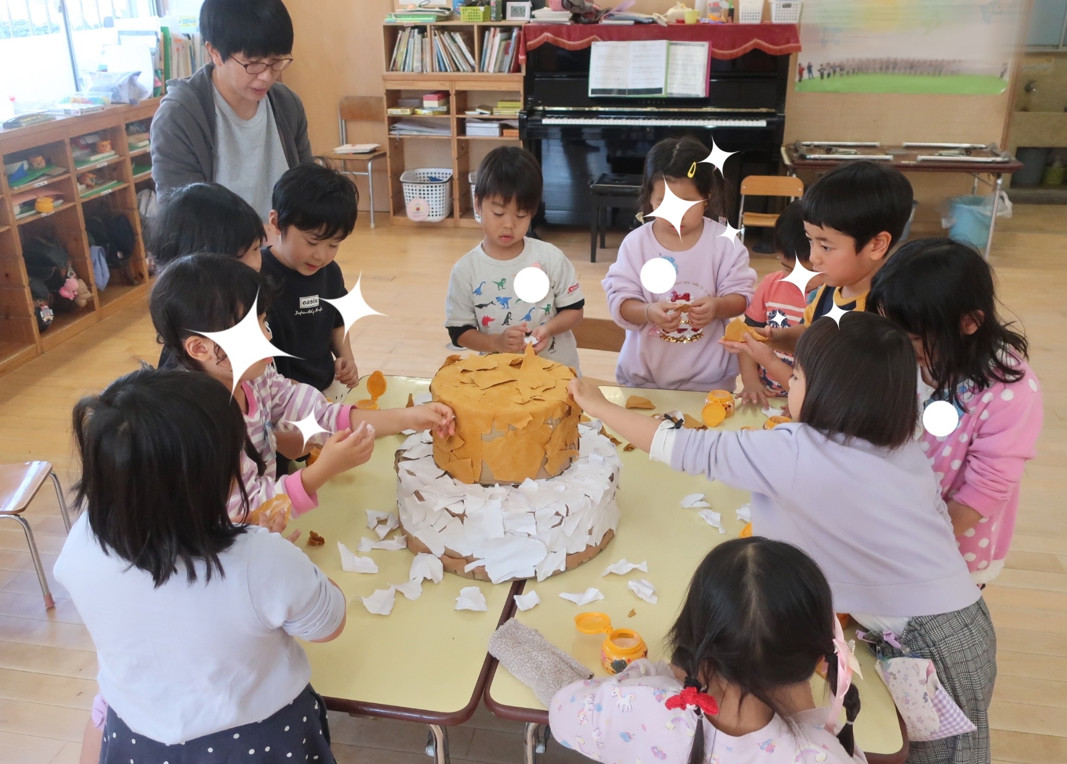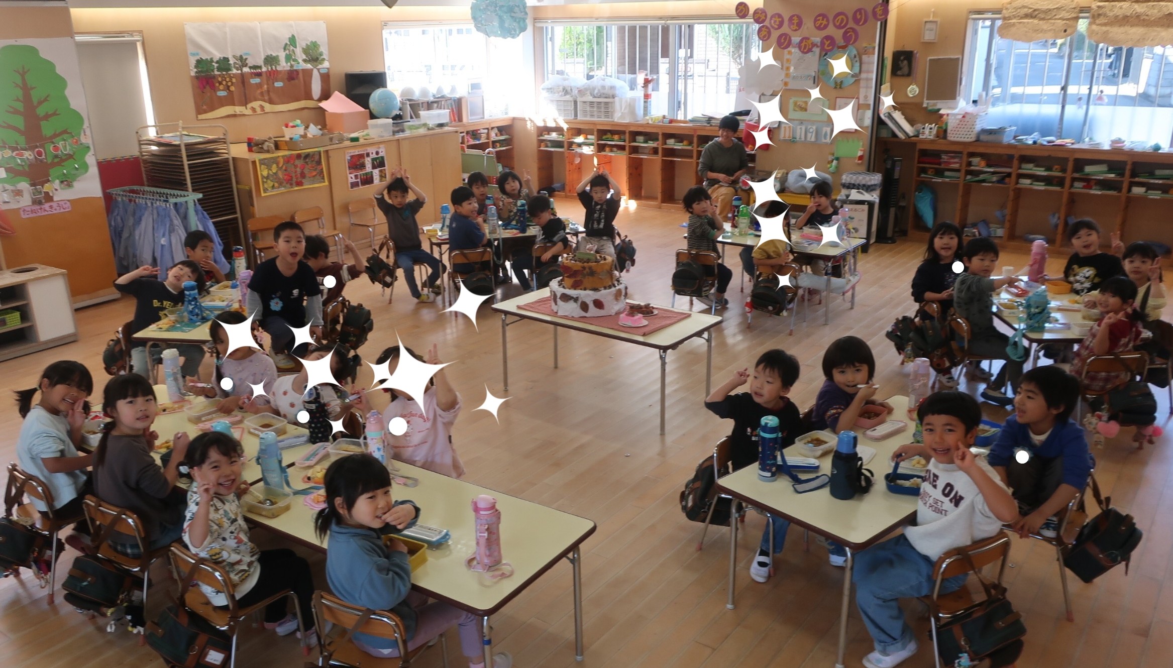 みんなが毎日見つけてきてくれた秋の葉っぱや遠足で拾ったどんぐりをケーキに飾り、かみさまにありがとうの気持ちを表しました。今日は収穫感謝食事会。できあがったケーキを囲んで嬉しいカレーパーティーをしましたよ😊mh