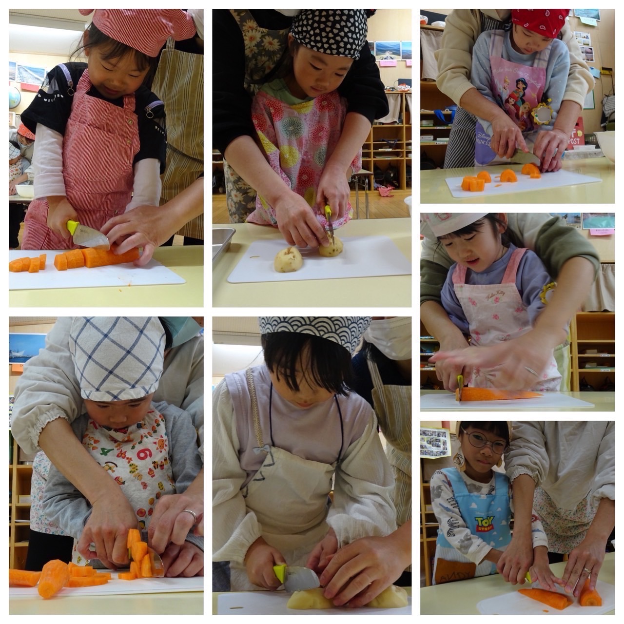 カレーパティーに向けて、いちごさんが洗い、どんぐりさんが皮をむき、たんぽぽ組は包丁で野菜切りをし力を合わせてカレーを作りました🍛