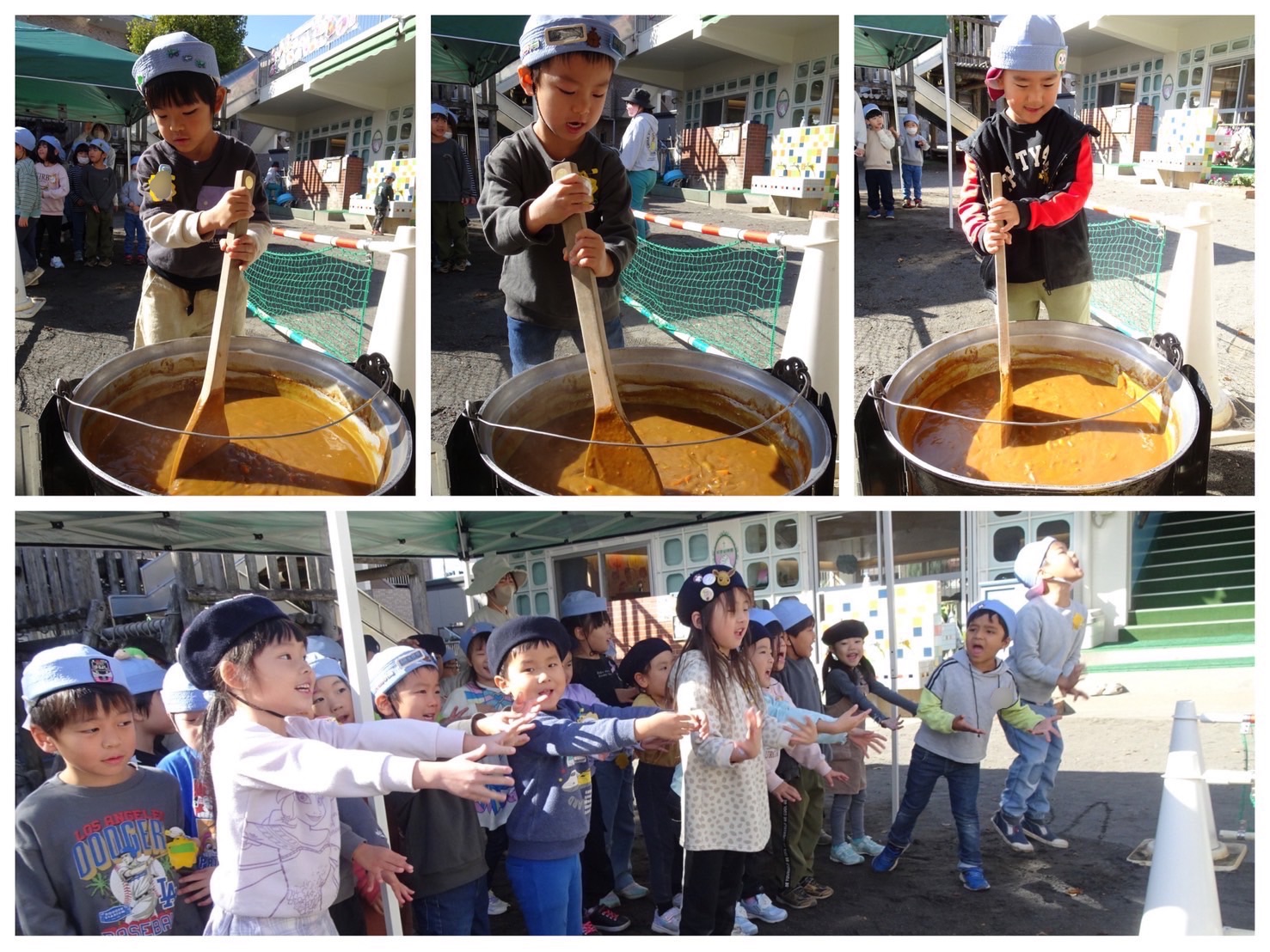 たんぽぽ組は、大鍋をまぜながら「とっても、あまぁく、おいしくなぁれ!」とみんなで考えたおまじないをかけ、さらに『キラキラキラ〜』とパワーも送って特別なカレーに仕上がりました。