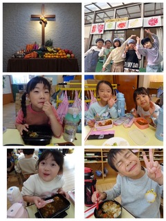 昭島幼稚園では、火曜日に収穫感謝礼拝、水曜日にカレーパーティーを行いました。持ち寄ったお野菜や果物を礼拝堂に飾り、豊かな実りに感謝する時をもちました。