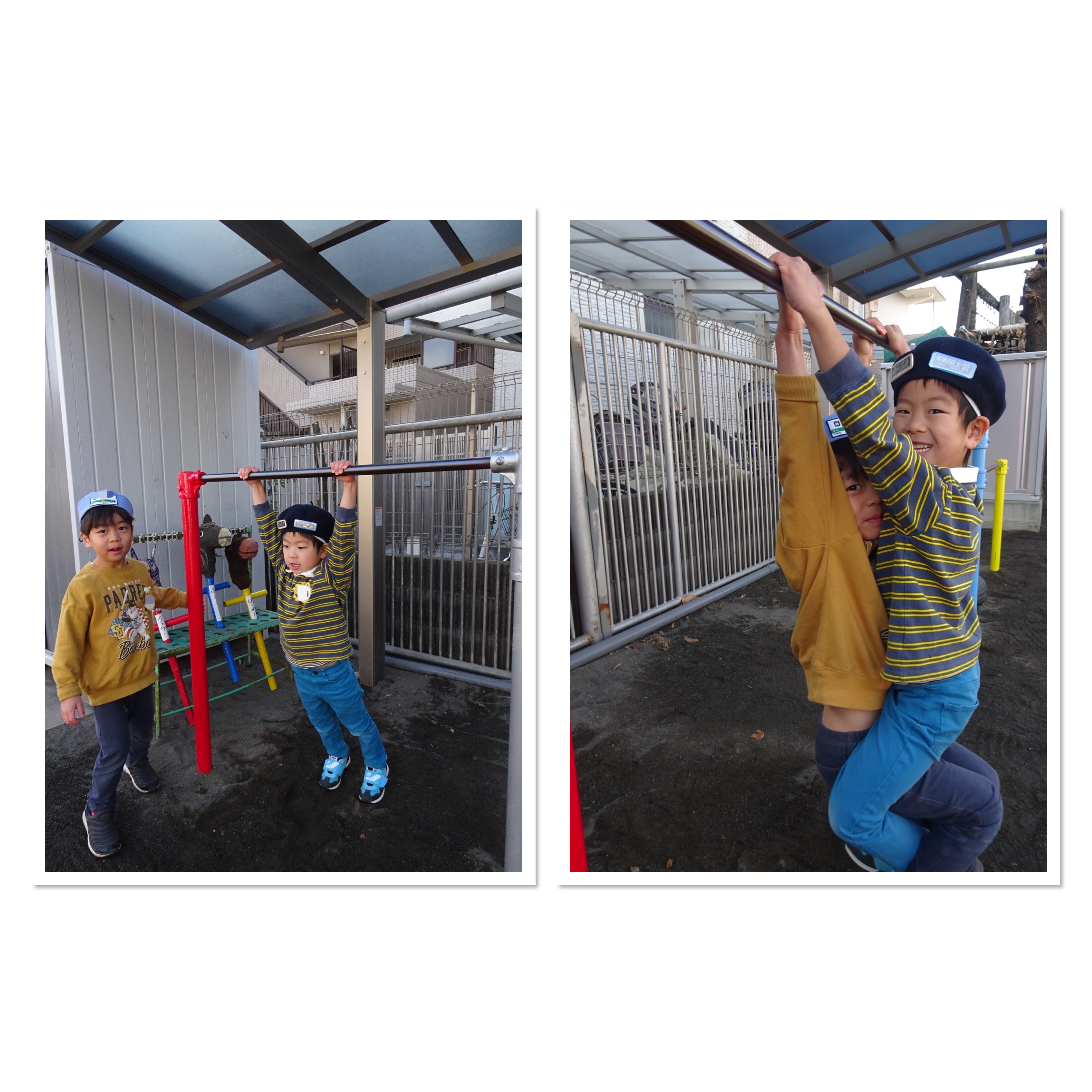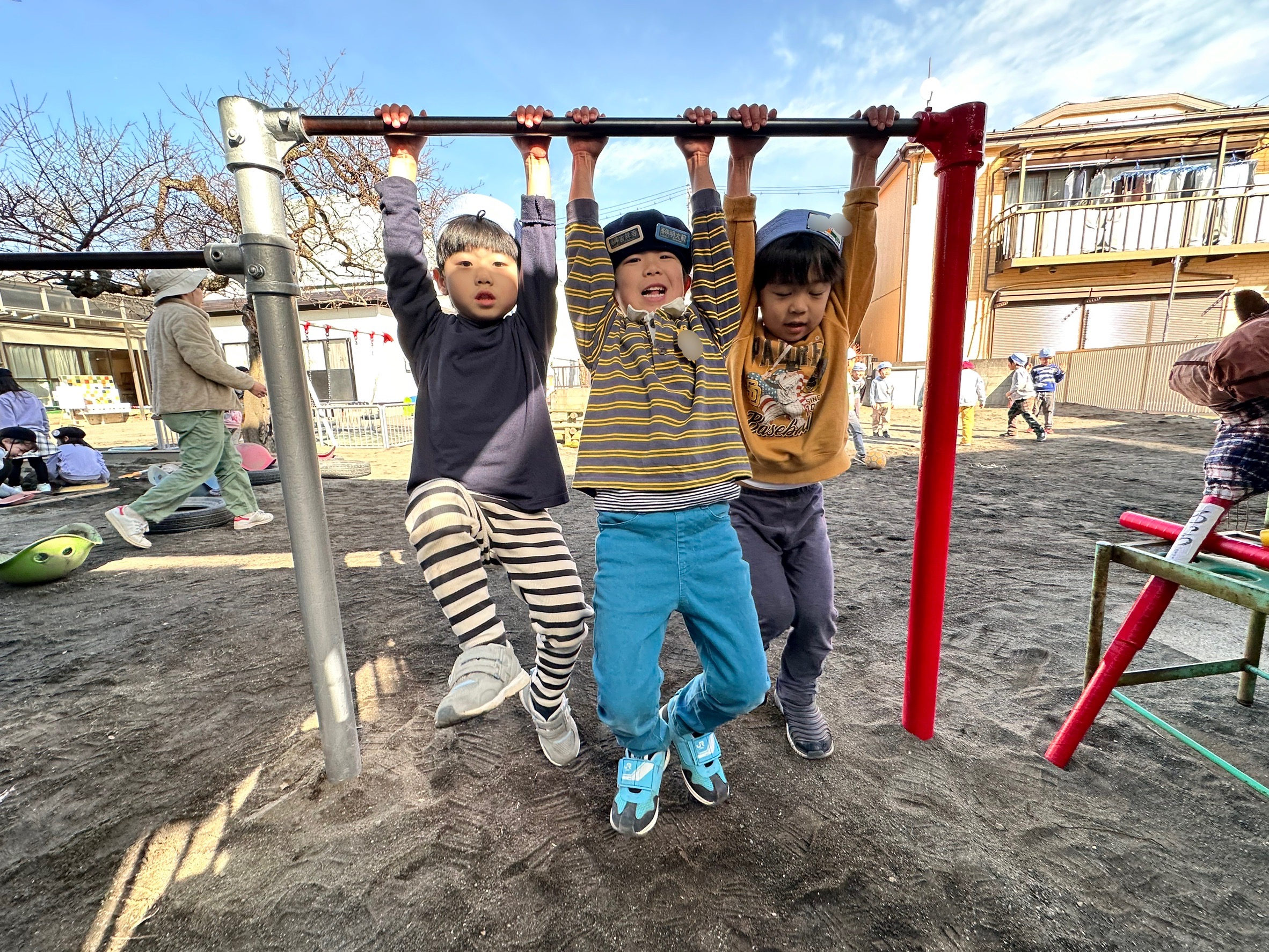 今日も、「前は一人でぶら下がってあそんでいたけど、2人でも鉄棒にぶら下がって遊べるし、もう一人誘って3人でぶら下がってあそべたんだよ!」と教えてくれました。