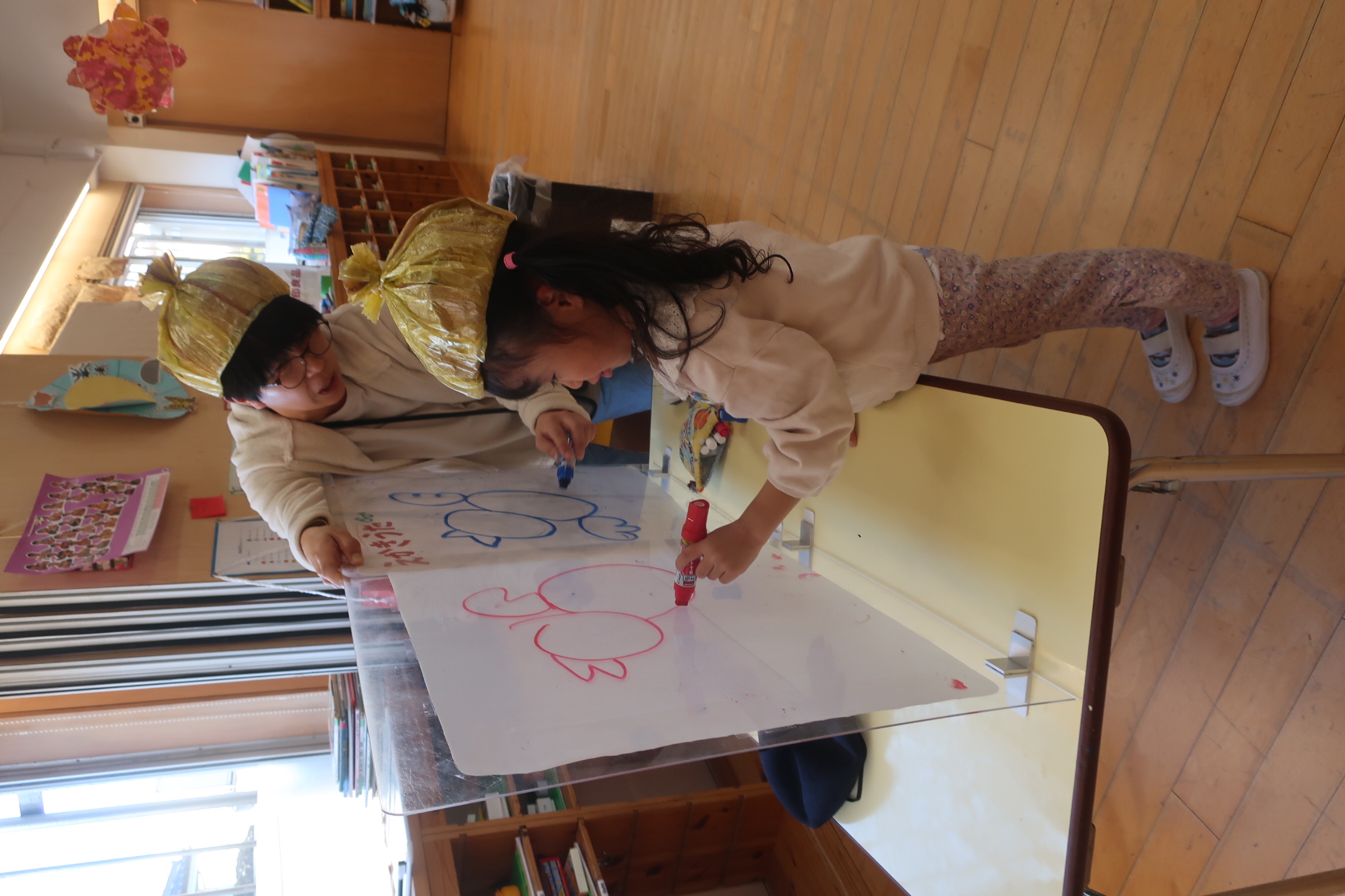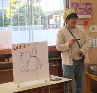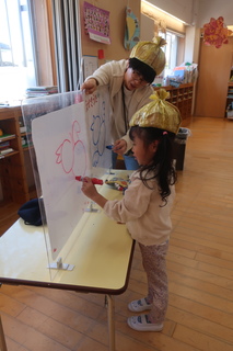 三学期、どんぐり組にやってきたのは「たまねぎ先生」H先生にちょっと似ている絵描き歌が得意な先生です。たまねぎ先生と同じたまねぎ帽子(小)をかぶると絵描き歌が上手に描けるのです✨毎日たまねぎ先生に会えるのを楽しみにしています🧅✨mh