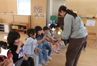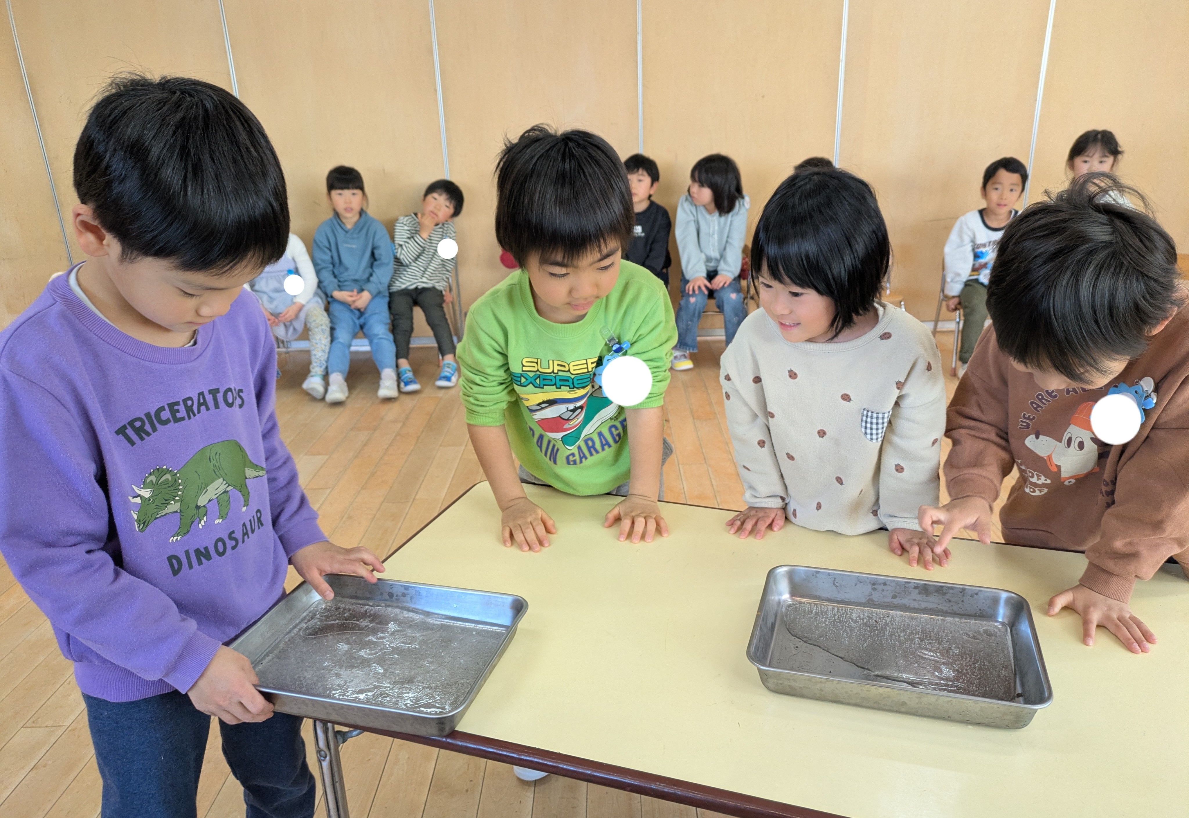 幼稚園のどの場所なら水が凍るかな?1回目は凍らず、蛇口から垂れる水が凍ったのをヒントにしかけ直してみると…大成功!大喜びのどんぐりさんでした😊mh