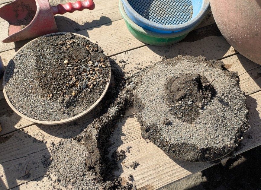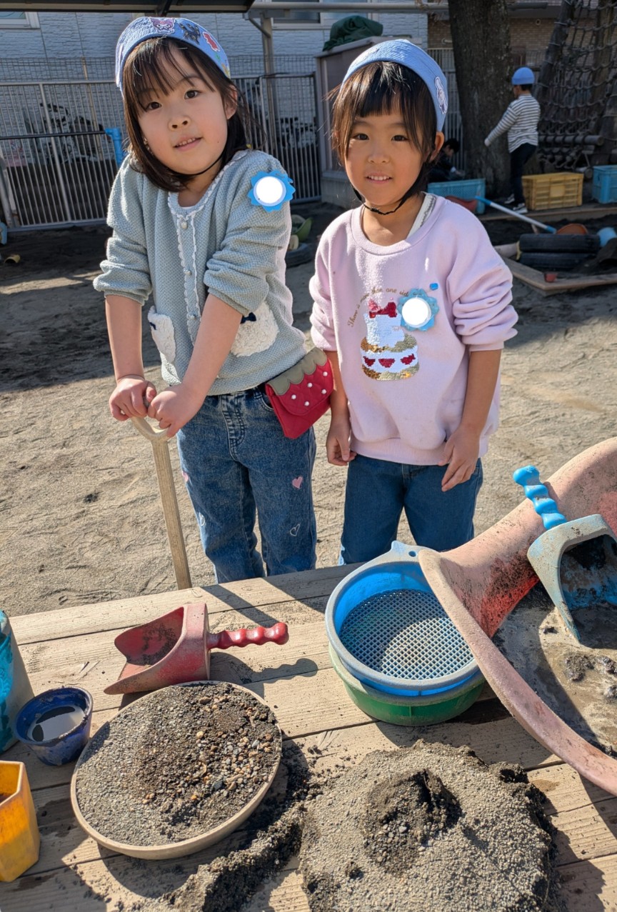 「お店に来てください!」行ってみると…おいしいカレーとケーキが並べらへていました🍛🎂ごはんやクリームは白い砂で、ルーの具材は小石を使って工夫されていましたよ😊mh