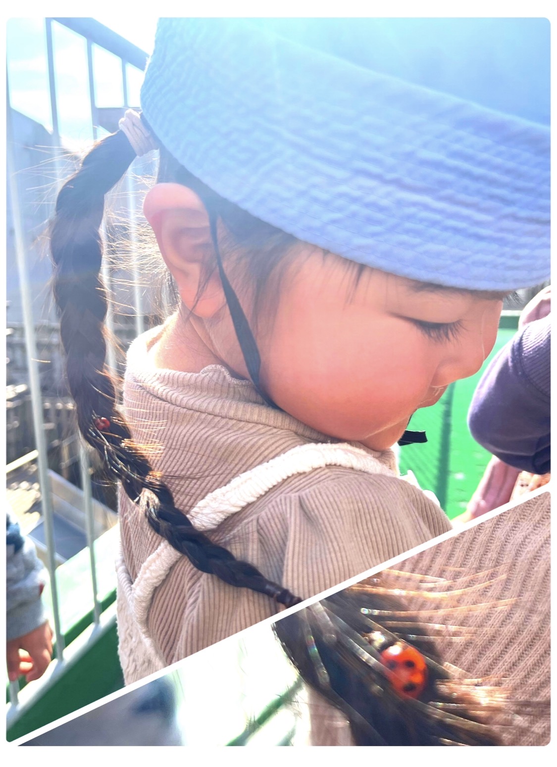 豆まきごっこのあと暦では立春。春の訪れを知ったいちごさん。さっそく春を見つけましたよ✨梅の木は蕾が膨らみ色付いていました。そしてテラスにはてんとう虫が遊びに来てくれました。暖かな日の出来事でした☺️ak