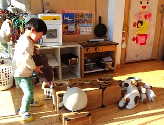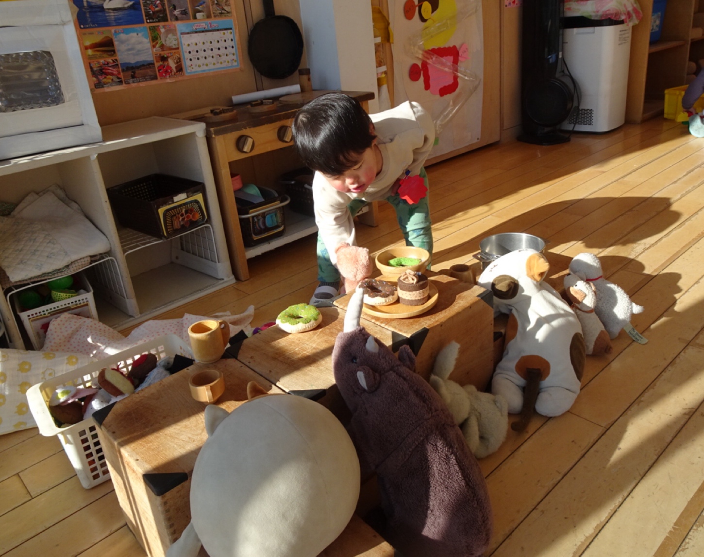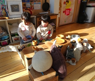 登園して朝のお支度が終わって遊び始めたRくん。今度は忙しそうに朝ごはんの支度が始まりました☺️「ご飯ですよー」そんな声が聞こえてきそうです♪後から来たSちゃんと一緒に食事が終わると、今度はお弁当を詰めています。次は幼稚園に出発かな⁈ak
