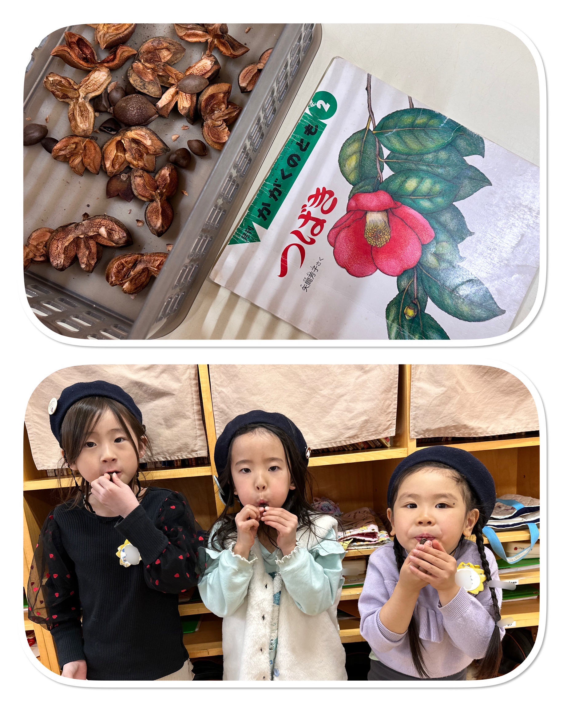 実は、M先生が拾ってきてくださった「つばきの種」で、笛づくりに挑戦しているところです。