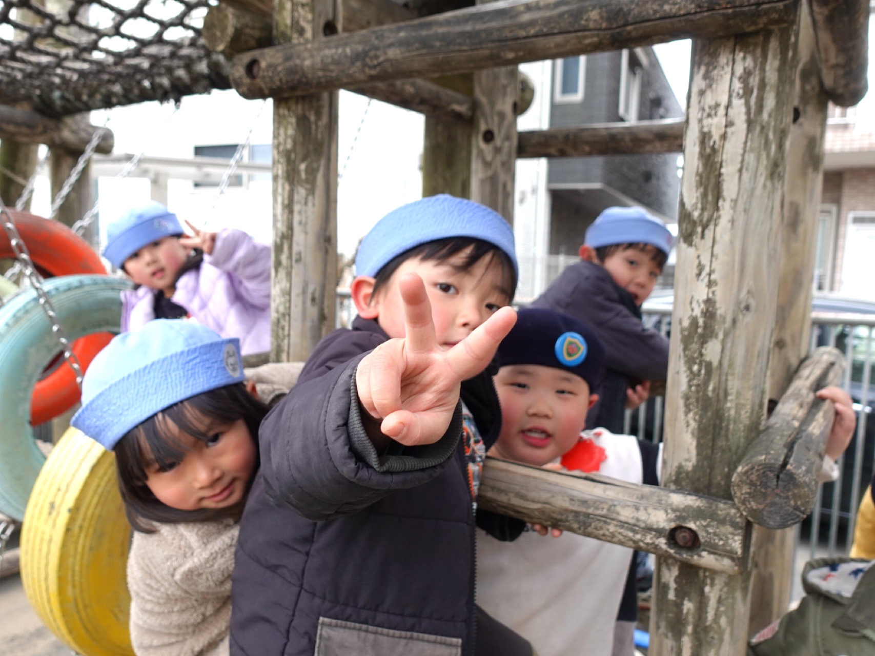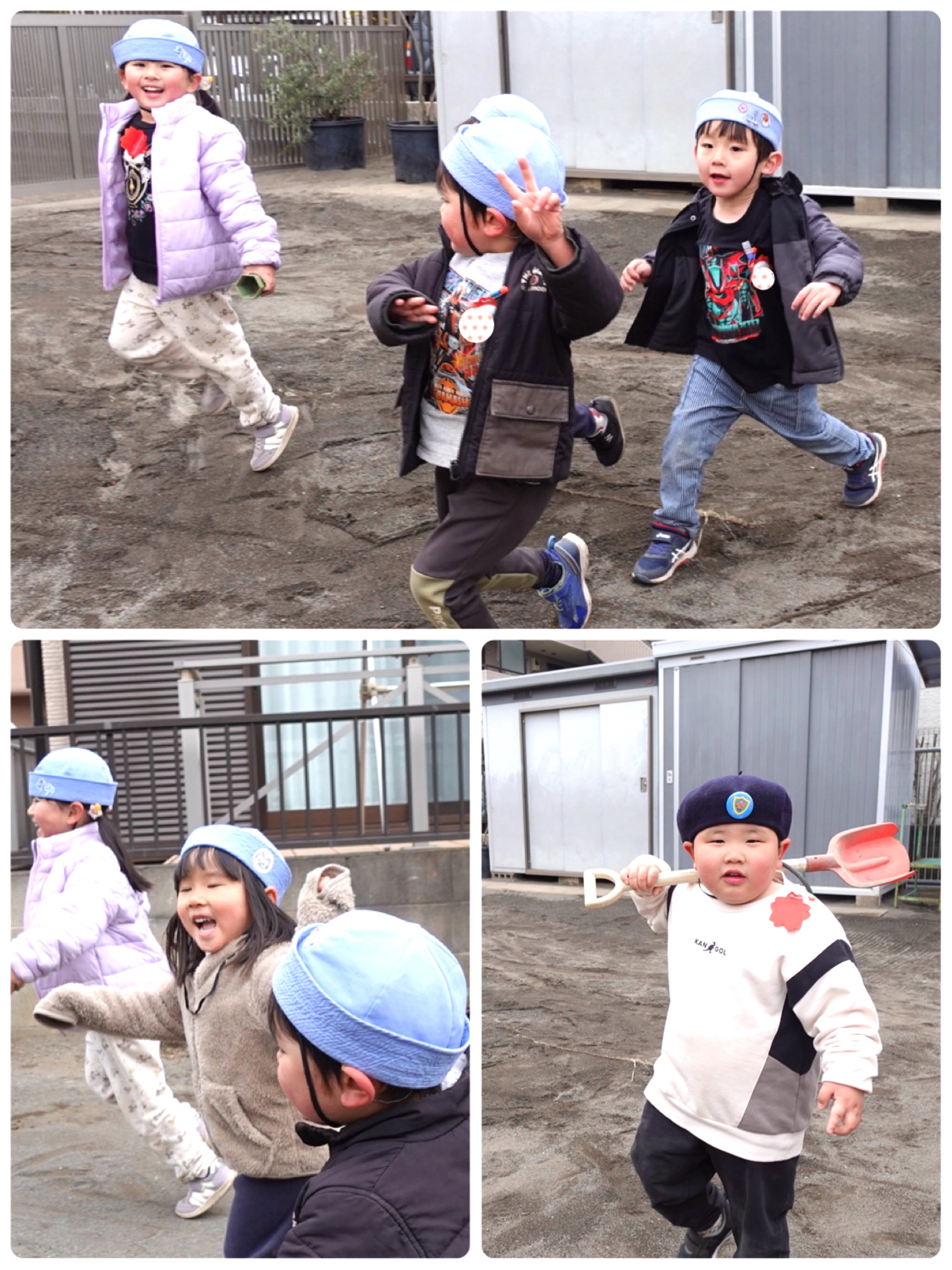 園庭の梅の木の下を元気な一行が走り抜けていきました。「ぼうけん!ぼうけん!」大きな掛け声の5人組😊これからみんなのどんな冒険がはじまるのかワクワクしますね!ak