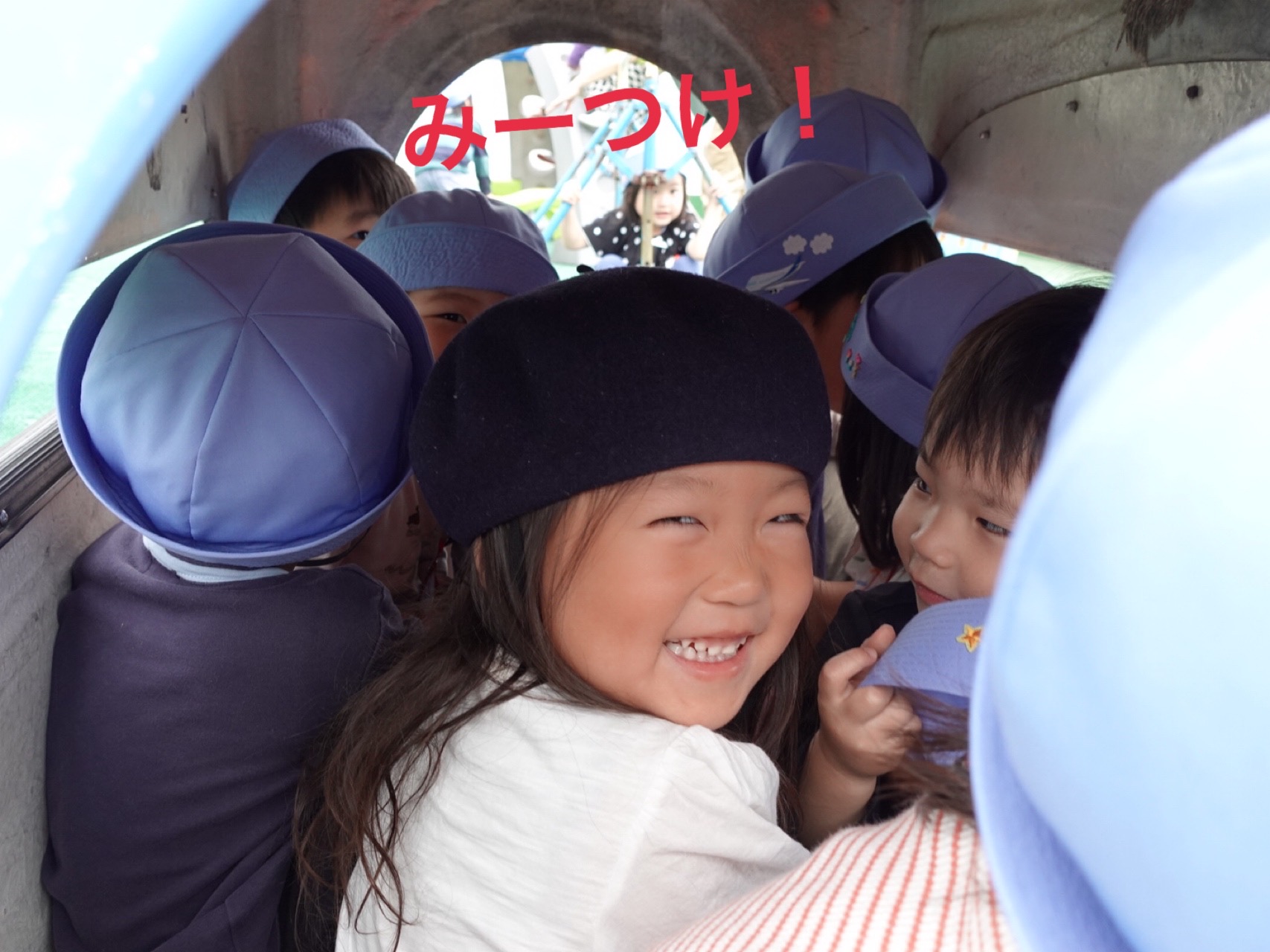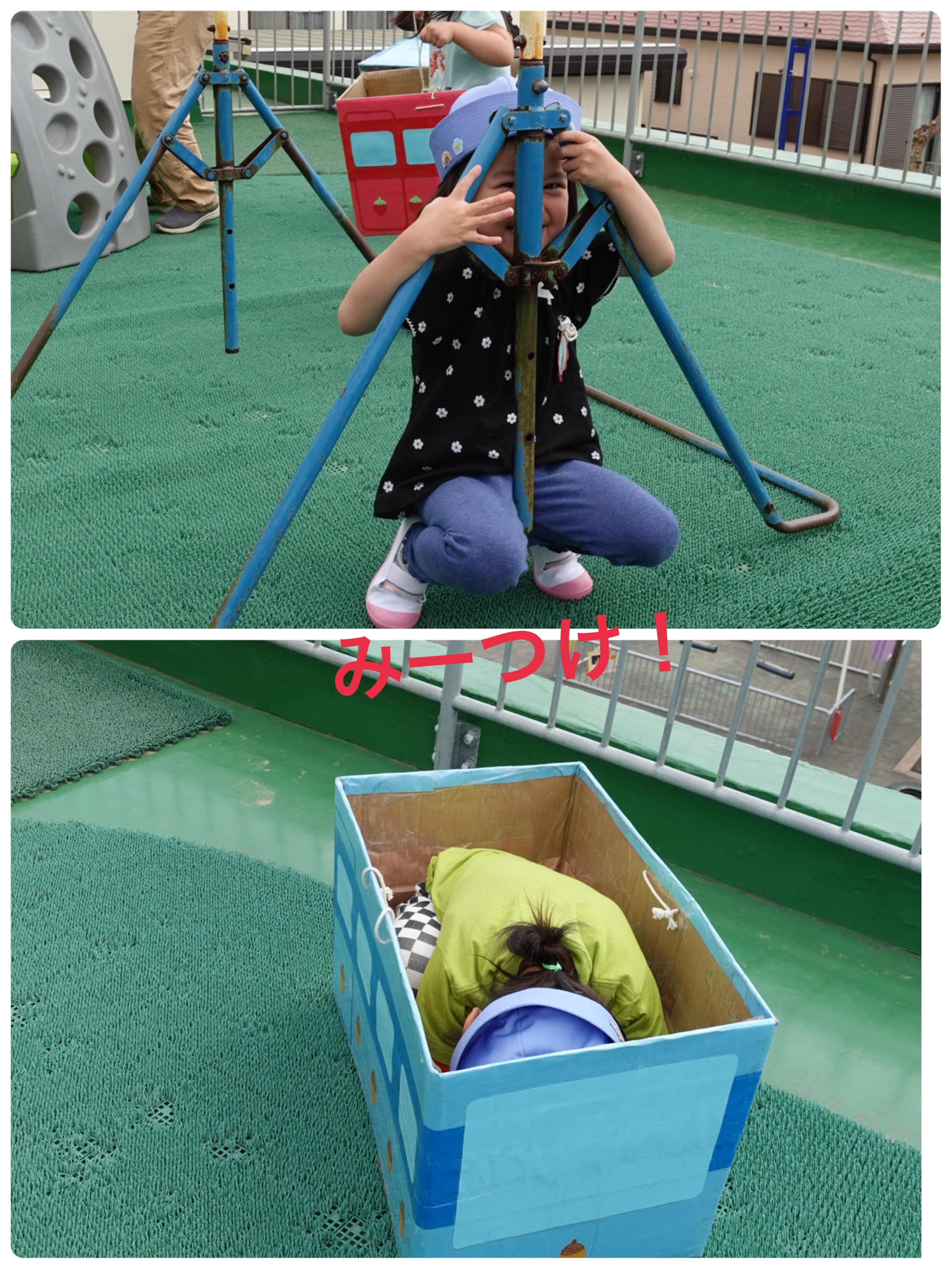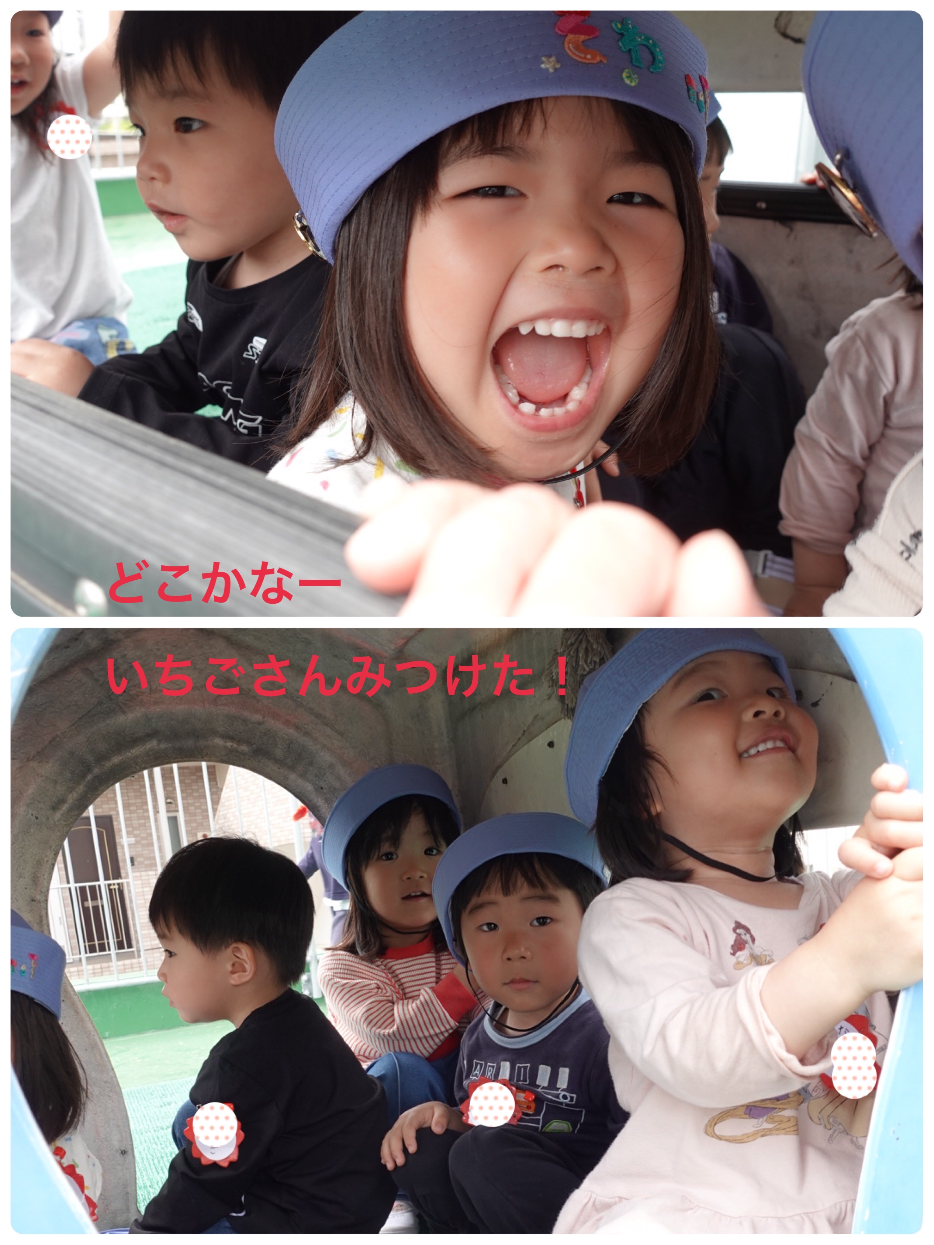 いちごさんのテラス遊びがはじまりました。早速Hくんが「先生かくれんぼしよう!」と誘ってくれました。「123…もういいかい?」と言うと「もういいよー」と明るく元気な声がたくさんの声が返ってきました。いちごさんどこかなー?みんなみーつけ!ak