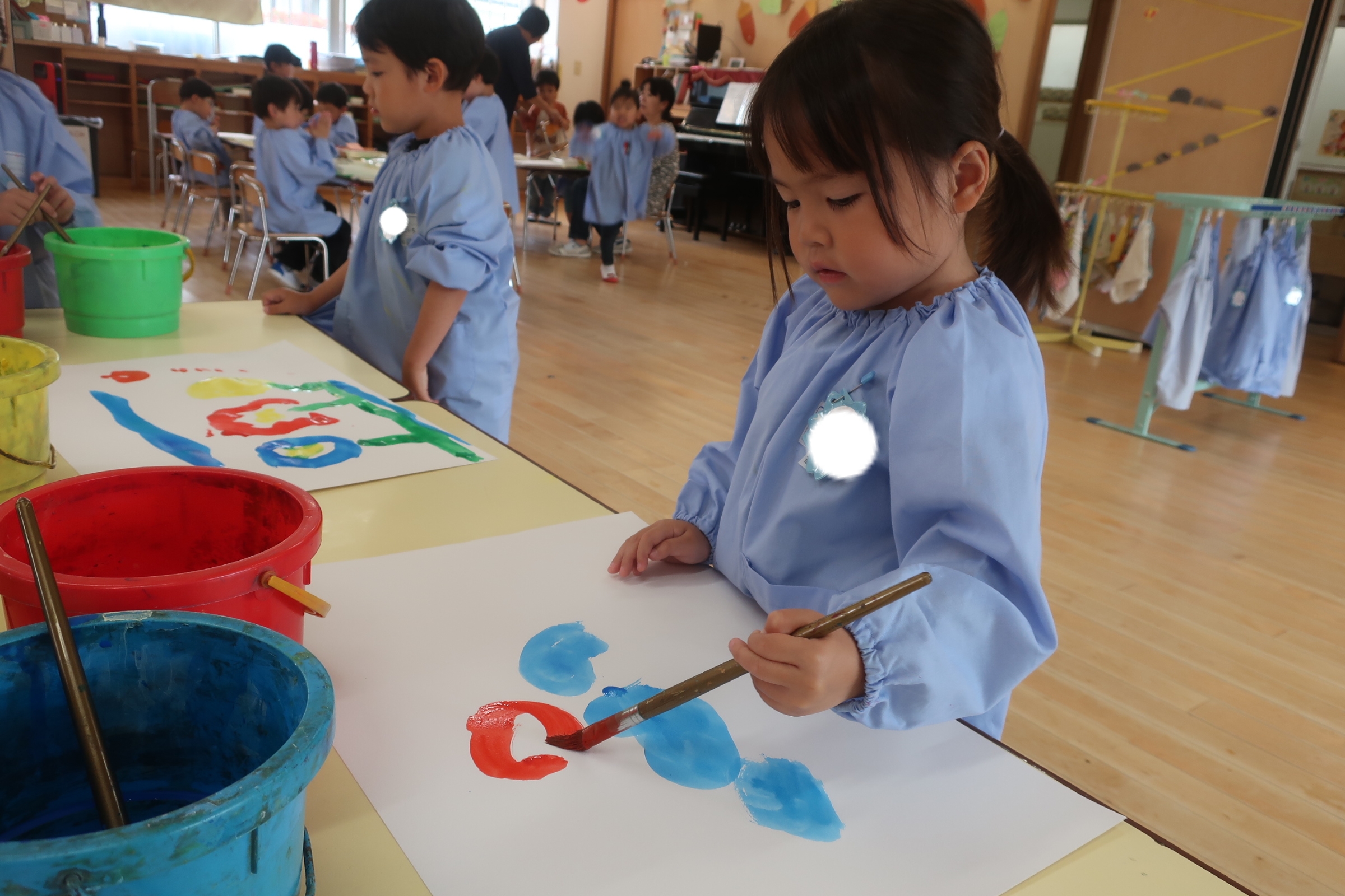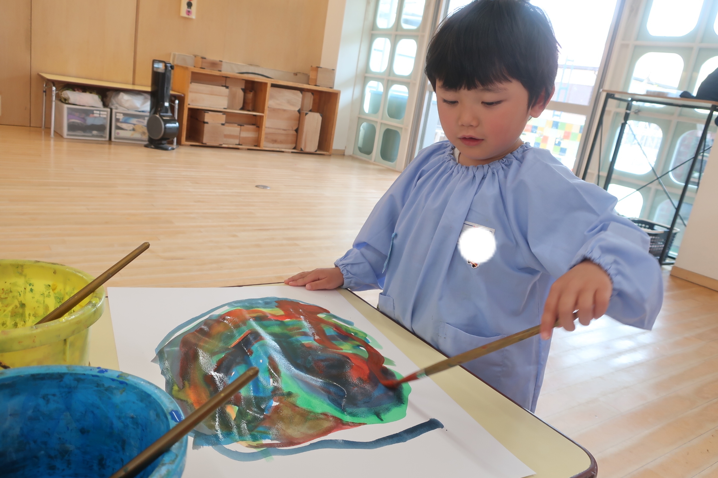 どんぐりさんは絵の具を使って製作中です✨赤・青・黄・緑、好きな色を選び、画用紙の上をのびのびと描き楽しんでいます。そしてこの楽しい絵の具遊びが何かに変身します😊楽しみですね!mh