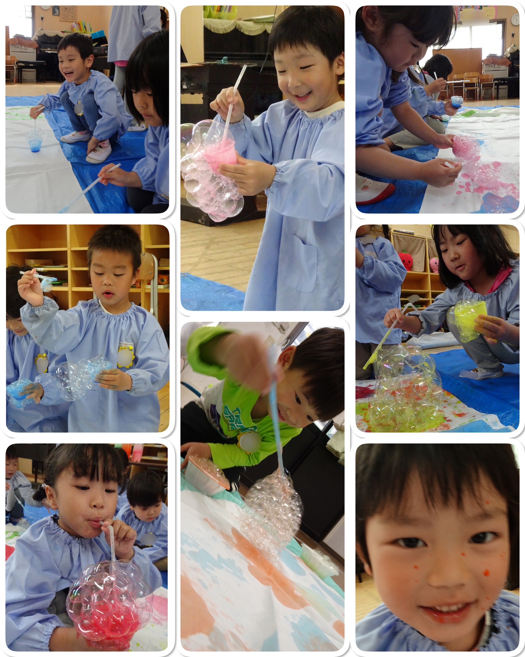ふわふわとした泡がはじけるたびに、思いがけない模様が生まれ、「きれい!」「すごい!」と声があがりました。