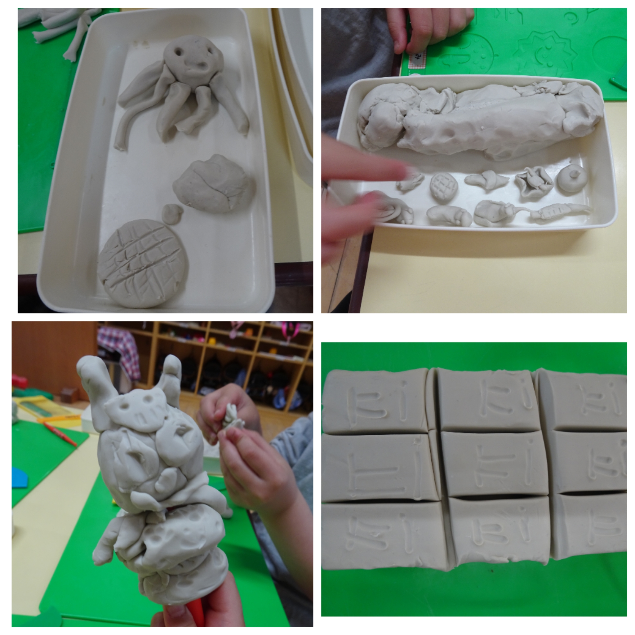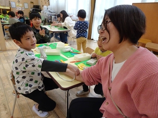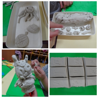 雨の降った昨日の木曜日に、たんぽぽ組では新年度になって新しく用意してもらった自分の粘土を使って遊びました。新しい粘土にみんな大喜び!みるみるうちに楽しい作品がいっぱいできました😊お顔を作ってみたり、餃子や小籠包を作ったり、粘土を長く延ばしてT先生と長さ競争をしたり…。Aくんは先生たちが元気でいられるように粘土で点滴を作って治療してくれました🏥雨の日に楽しいお部屋遊びができました✨OKK