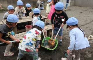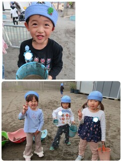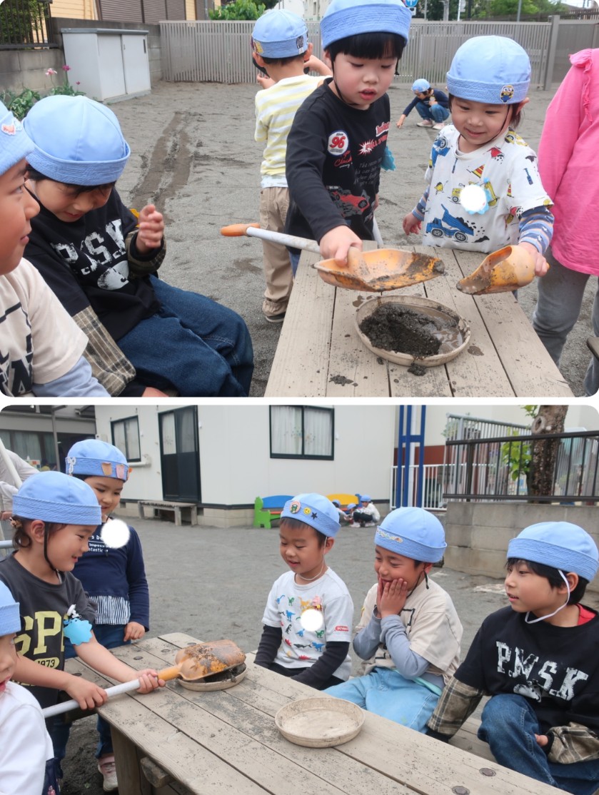 白い砂と黒い砂を混ぜてカレー屋さんごっこをしていたら、たんぽぽさんのお友達がカレーを食べに来てくれましたよ🍛お客さんが来てくれたことが嬉しくて、ついついカレーは大盛りに。「おいしー!」の声にますます嬉しくなるどんぐりさんでした😊mh