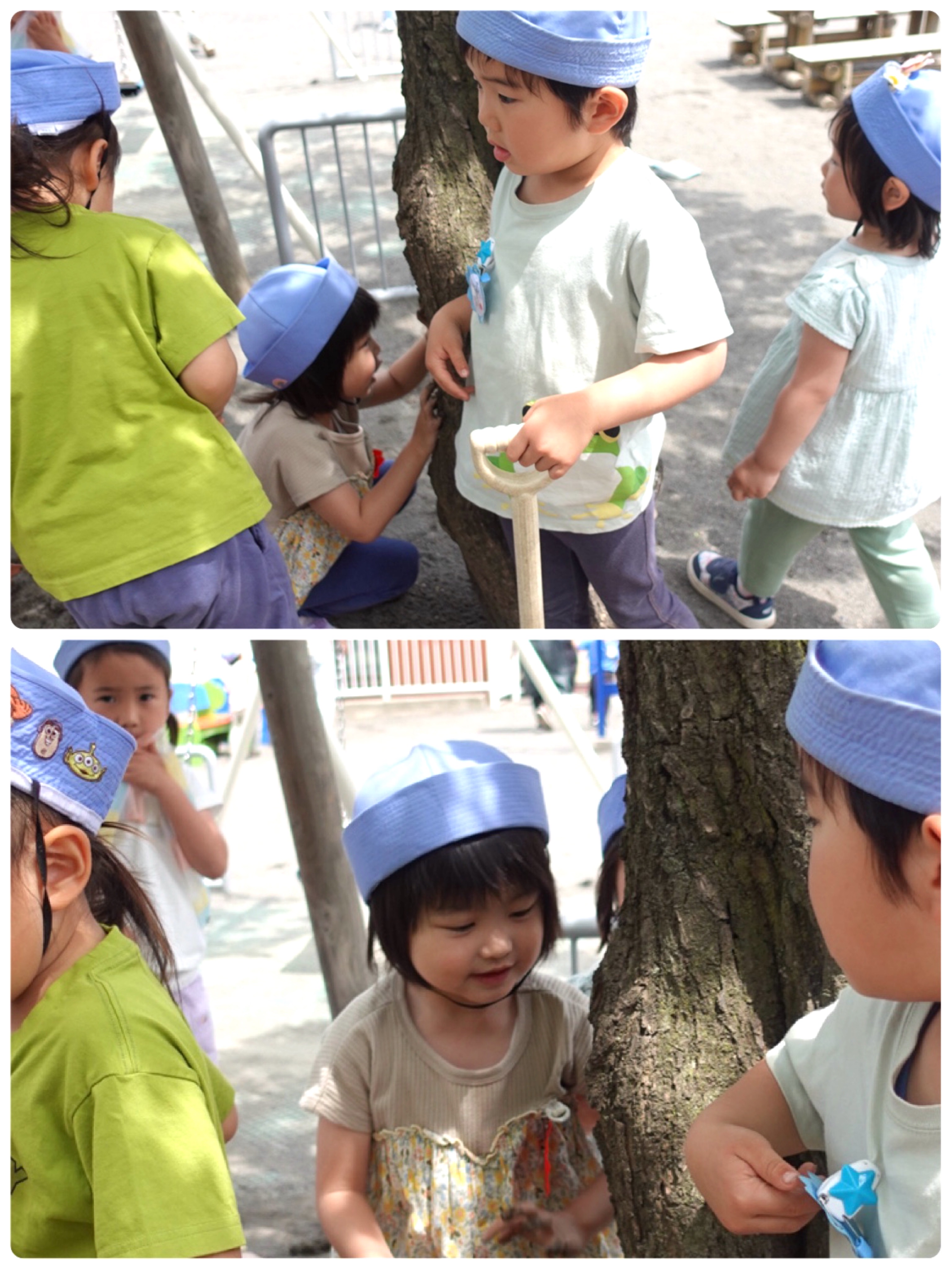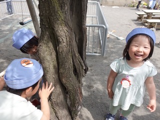 「先生、何かいるみたい」園庭でそう呼ばれました。見に行くといちごさん、どんぐりさん、たんぽぽさんの子どもたちが梅の木に集まっています。「何がいるの?」M「ここ何かいるみたい」たんぽぽさん「蜘蛛じゃない?」どんぐりさん「砂じゃない?」I「じゃ、すなババだ」「えっ?妖怪のすなかけババア?」I「そうだよ!じゃ砂あげなきゃ」と、言うわけでせっせせっせと砂を運んだ日でした。ak