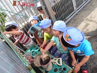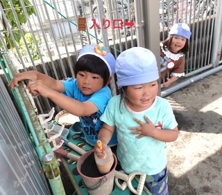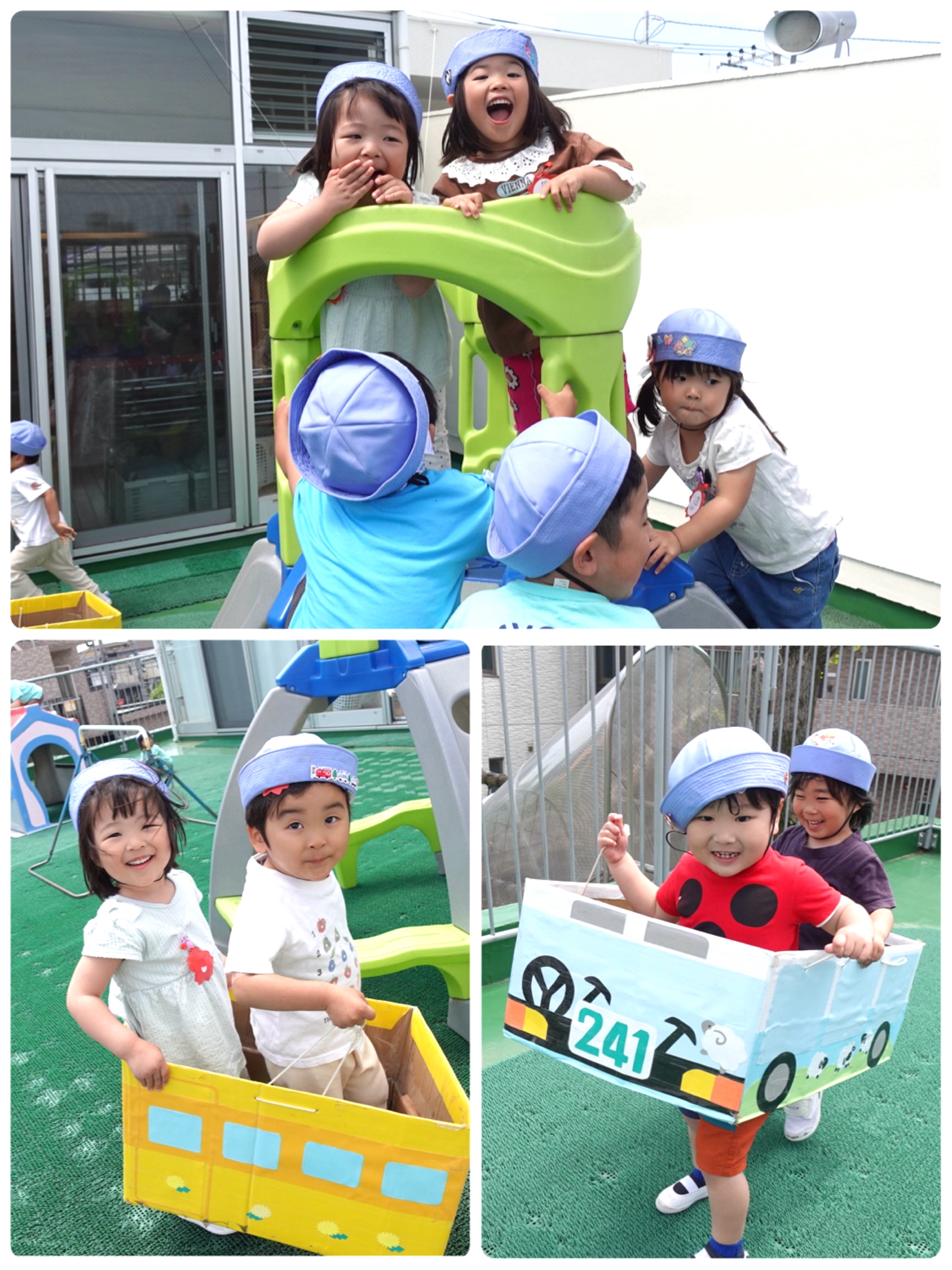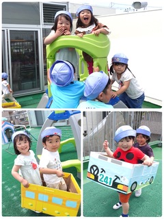園庭の隅に荷物をたくさん運んでいるRくんとIちゃん。「何屋さんですか?」R「病院でーす」I「今お薬作ってまーす」薬を注文して取りに行った時には満員の病院になっていました。園庭の隅なのに、人気の病院はさすがですね✨I「ドアはこっちです」と案内されましたが、先生通れなかった、、、。ak