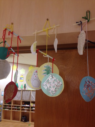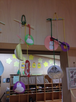 今楽しみにしているクリスマスのお祝いをしたら、もうすぐ冬休み。休み中も楽しく過ごし、大事なことを忘れないようにモビールのお約束表を作りました。たんぽぽ組(年長)ならではの細やかな作品になりました!雪の結晶、雪だるまやお餅など…個性の豊かさも光ります。TA