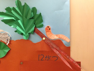 いちごさん(年少組)の畑には黒くて長ーいゴボウができ、にょろにょろミミズさんがやってきました~。12月の野菜のゴボウ、強い歯を使いよく噛んで食べてみてくださいね(^O^)mh