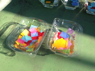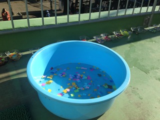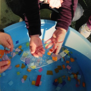 きれいな氷を作るために、細かく色紙を切って、小さな容器と大きなタルにお水をはってみました!どうなるかなあ?氷になるかなあ?とわくわくを膨らませながら帰り、次の日幼稚園に来てみると…ぴかー!きらー!っとお水が氷に変身★冬ってたのしいね(^O^)mh