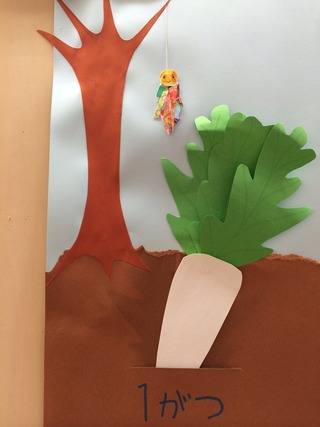 いちご組の1月の誕生日表の畑から、太った大根が獲れました。寒い季節においしい大根を、たくさん食べましょう(^O^)頭上の木には、ゆらゆら蓑虫がゆれています。枯葉や枯れ枝でつくった蓑に包まれて、寒い冬を越すのですね。蓑虫さんがんばってね。さて、いちごさんはただいま凧の製作中。一人ひとり思い思いに絵を描きました。凧ができたら凧上げに出かける予定です。お楽しみに\(^o^)/IH
