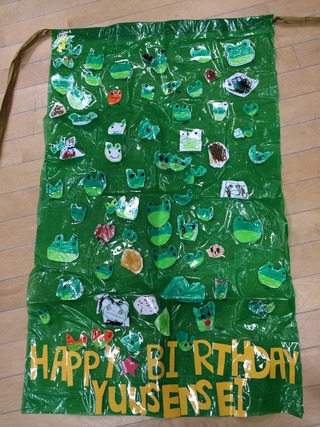 今日はY先生のお誕生日。その事を知ったどんぐり組みでは何かプレゼントをしたい…!と、いうことで考えたところ、カエルのマントを、プレゼントすることにしました。今日まで秘密で準備…♡ふぅ。言いそうになるのをこらえて、プレゼントはびっくりで渡す事ができました。たくさんのどんぐりさんの気持ちはきっと伝わったね。Y先生、おめでとうございますーMK