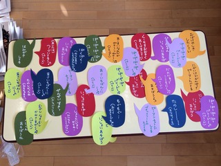 一体このセリフは誰が言ってるでしょう?どんぐりぐみの子どもたちが、大きくなったことを思う存分!表し、また、一生懸命、自分を作りました。その、自分が、色々言ってます。歌ってます。食べてます明日の作品展では、子どもたちの力作の作品をぜひ、みていただけたらと思います。また、作品袋に表した昭和記念公園の絵(この間の遠足の絵)と、自分の顔の絵も見てください☆ぜひぜひ、どしどし、見にいらしてくださいMK