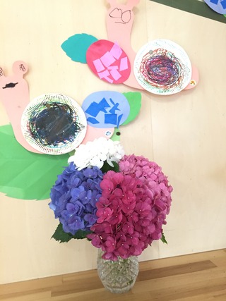 いちご組では梅雨の時期を感じながら、製作をしました。紫陽花は、初めて自分のハサミとノリを使って。かたつむりは実習生と作りました。先生たちのお庭から本物の紫陽花も届いてキレイでした♪TA