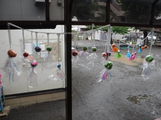 明日は年長組の親子遠足の日。しかし天気予報では…(*_*)「雨雲を吹き飛ばすぞー!」っとてるてるぼうずを作り、つるしました。楽しみにしている遠足、みんなの思いが届き、晴れますようにっmh