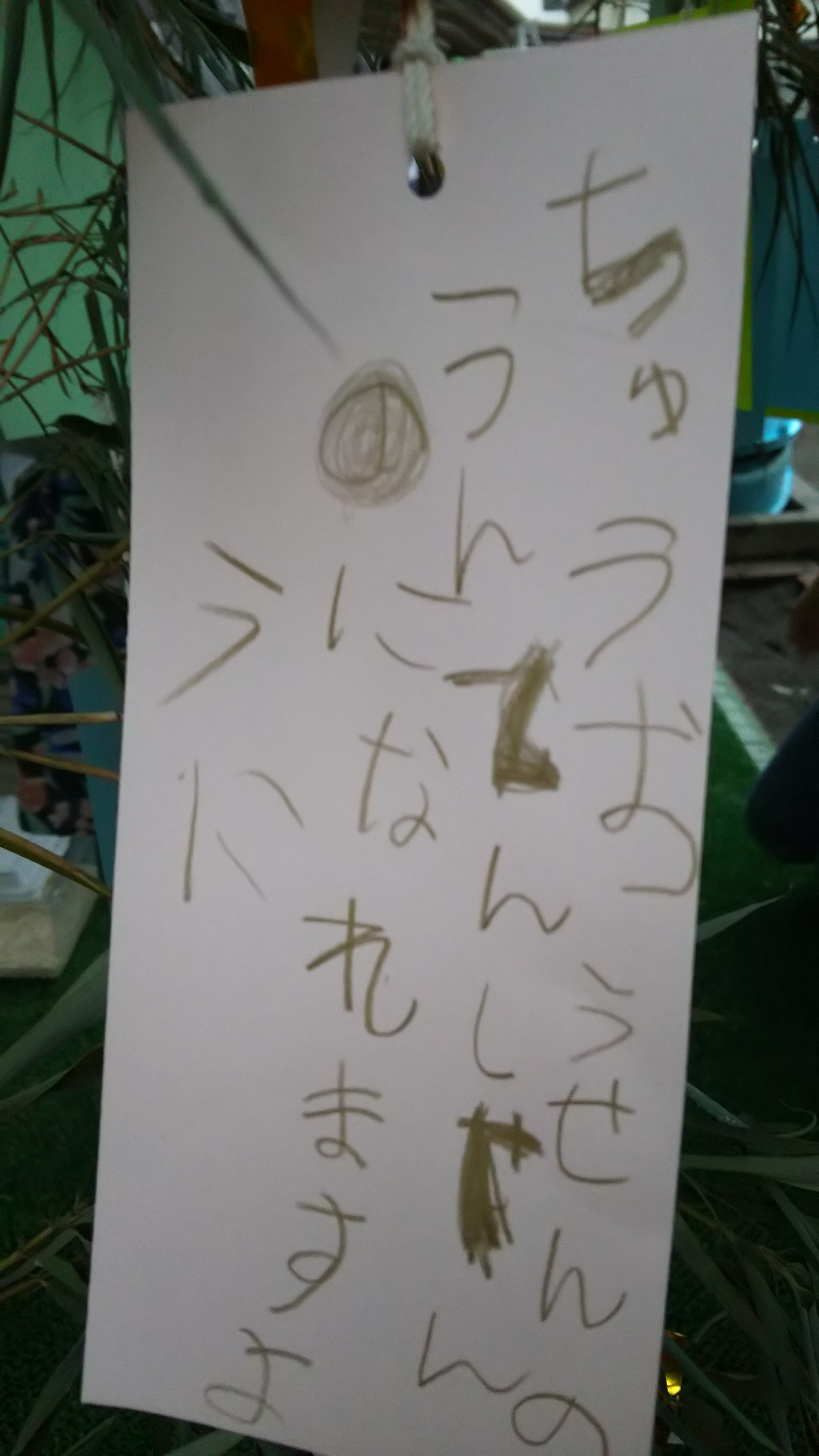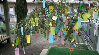 今日は七夕ですね。今年も卒業生のお父さんのKさんから立派な笹をいただき、すてきな七夕飾りができました。こどもたちも飾りを作ったり、それぞれの願い事を短冊に書いて飾ったり…☆みんなの願い事が叶うといいね(^^)OKK