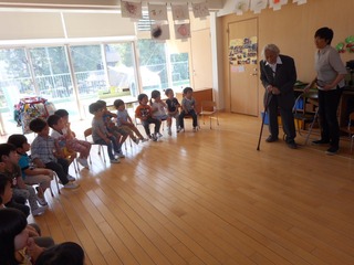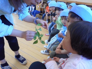 いちご組に新しい仲間が来ました!青虫の赤ちゃんです。「うわぁ〜!ちっちゃいねぇ!」「ちょっと大きくなってる!」「可愛いね!」など口にし毎日楽しみに眺めているいちごさんです。先日お誕生日だった理事長先生のお誕生日会をしました。いちごさんが大好きな昭島幼稚園の歌をプレゼントしました!理事長先生のハーモニカに合わせて歌も歌って、最後には理事長先生と握手をしてお祝いをしたいちごさんでした!とても良い時間でした。R