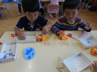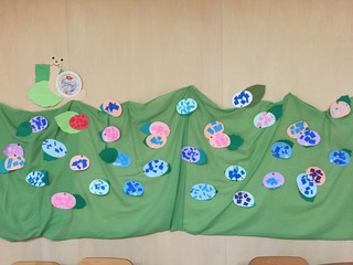 雨の日はお部屋の中でブロックやつみき、粘土やお絵描きなど自分で遊びを見つけて遊べるようになってきたいちごさんです。そんないちごさんはハサミとのりを使った製作を始めました!この時期にぴったりなあじさいを作りました♪完成した物を壁に飾るととても嬉しそうでした(*^_^*)また担任のマークのアスパラガスの葉っぱとアスパラガスをみんなで触ったり見たりしました!興味津々のいちごさんでした!R