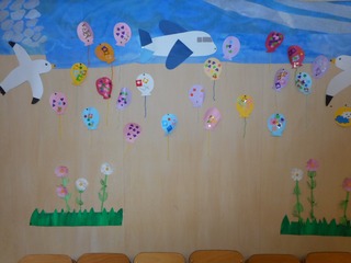 2学期も始まりいちご組の壁面は空のテーマに沿って、飛行機やバルーンが飛んでいます!自由制作の中でバルーンを作り飾っています。夜空もあり、月の満ち欠けも再現して子どもたちも空に親しみをもって過ごしています。また敬老の日の取り組みでおじいちゃんおばあちゃんを呼び、昔遊びをしたり歌を歌ったり、肩をとんとんたたく、とんとんパーティーも行いました!おじいちゃんおばあちゃんたちと触れ合えて仲良しになり、とても楽しそうないちごさんでした♪R